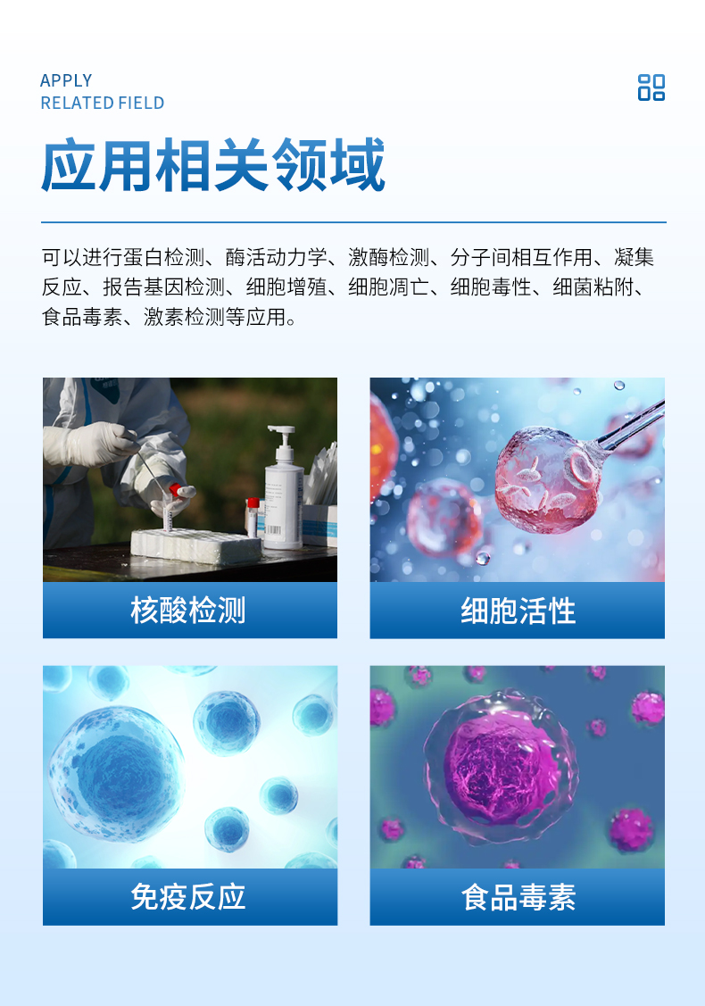 儀器廣泛應(yīng)用于核酸、免疫、細(xì)胞分析領(lǐng)域的相關(guān)研究,可以進(jìn)行蛋白檢測、酶活動力學(xué)、激酶檢測、分子間相互作用、凝集反應(yīng)、報(bào)告基因檢測、細(xì)胞增殖、細(xì)胞凋亡、細(xì)胞毒性、細(xì)菌粘附、食品毒素及激素檢測等應(yīng)用。