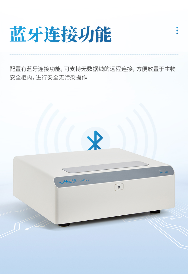 儀器配置有藍牙連接功能,可支持無數(shù)據(jù)線的遠程連接,方便放置于生物安全柜內(nèi),進行安全無污染操作。