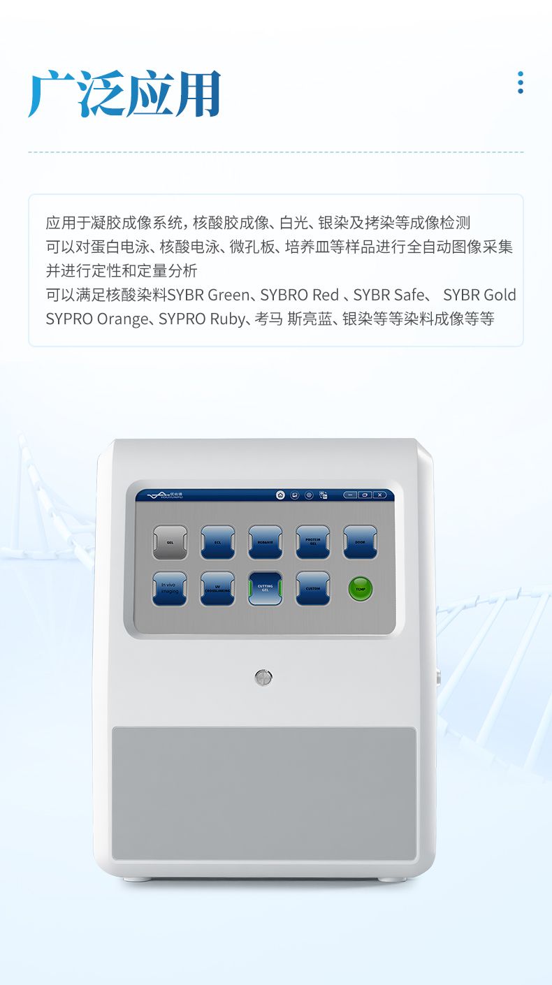 應用于凝膠成像系統,核酸膠成像、白光、銀染及拷染等成像檢測??梢詫Φ鞍纂娪?、核酸電泳、微孔板、培養皿等樣品進行全自動圖像采集并進行定性和定量分析。可以滿足核酸染 料 SYBR Green、SYBRO Red 、SYBR Safe、 SYBR Gold、SYPRO Orange、SYPRO Ruby、考馬 斯亮藍、銀染等等染料成像等等