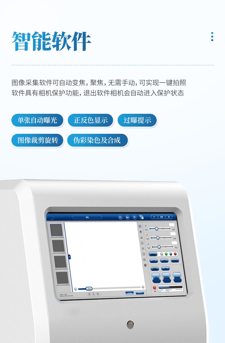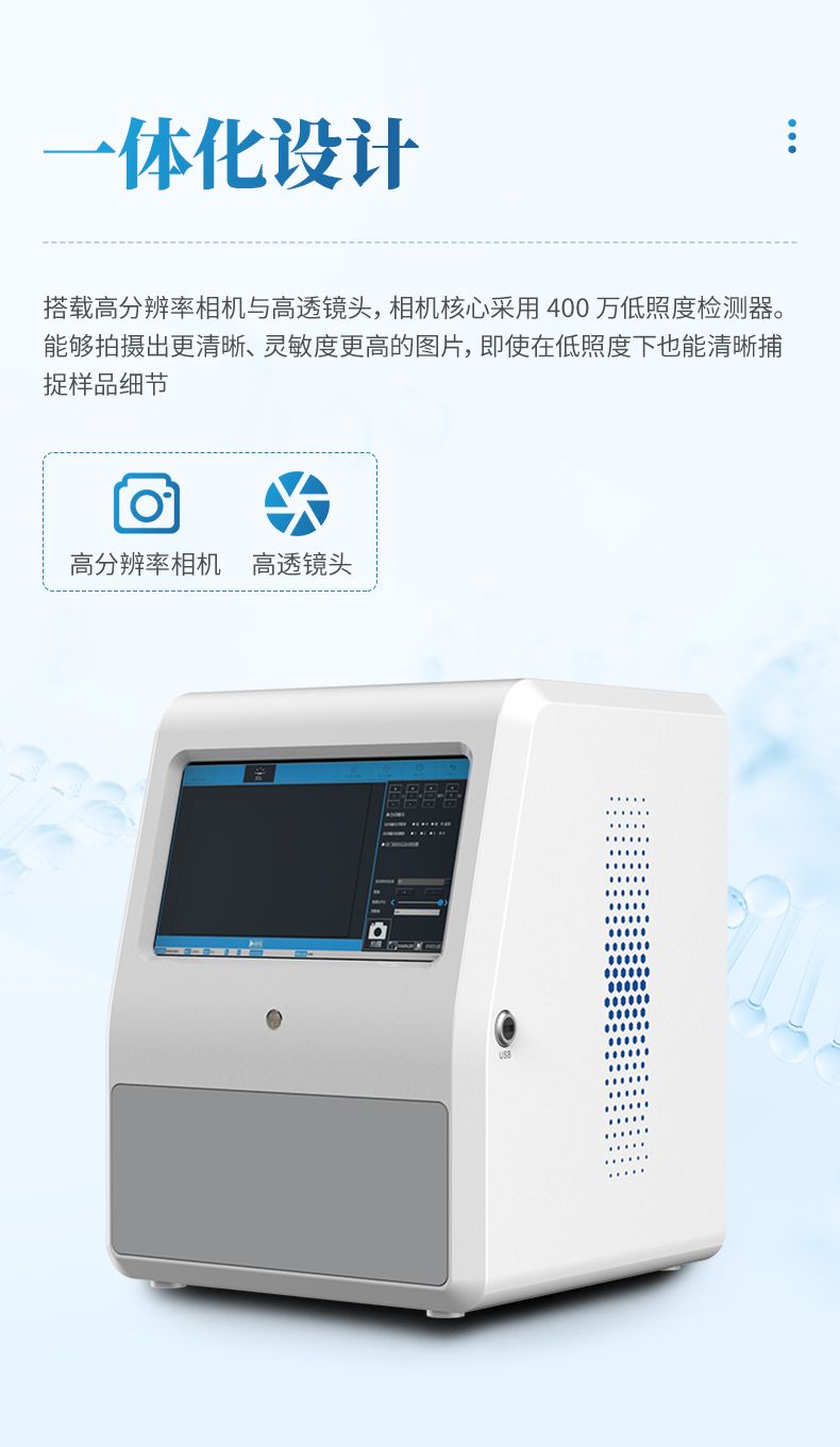 采用 13.3 寸觸摸屏控制,內存 16G,256G 固態硬盤,使儀器具有更強大圖像計算及 處理能力,配合圖像采集軟件操作簡捷直觀,軟件具有自動采集信號,并進行自己處理合  成功能;曝光模式分為自動曝光、手動曝光、以及自動定義曝光功能。配合圖像分析軟件  可對圖像信號進行定性定量分析。