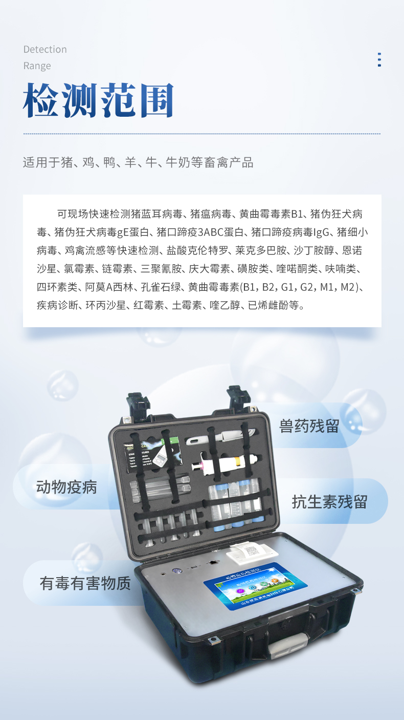 動物疫病診斷儀可現場快速檢測豬藍耳病毒、豬瘟病毒、黃曲霉毒素B1、豬偽狂犬病毒、豬偽狂犬病毒gE蛋白、豬口蹄疫3ABC蛋白、豬口蹄疫病毒IgG、豬細小病毒、雞禽流感等快速檢測、鹽酸克倫特羅、萊克多巴胺、沙丁胺醇、恩諾沙星、氯霉素、鏈霉素、三聚氰胺、慶大霉素、磺胺類、喹喏酮類、呋喃類、四環素類、阿莫西林、孔雀石綠、黃曲霉毒素(B1,B2,G1,G2,M1,M2 )、疾病診斷、環丙沙星、紅霉素、土霉素、喹乙醇、已烯雌酚等項目的定性檢測。