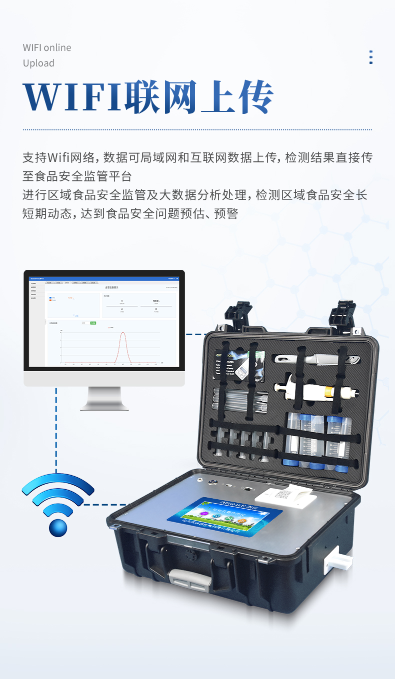 13、支持Wifi網絡,數據可局域網和互聯網數據上傳,檢測結果直接傳至食品安全監管平臺。進行區域食品安全監管及大數據分析處理,檢測區域食品安全長短期動態,達到食品安全問題預估、預警