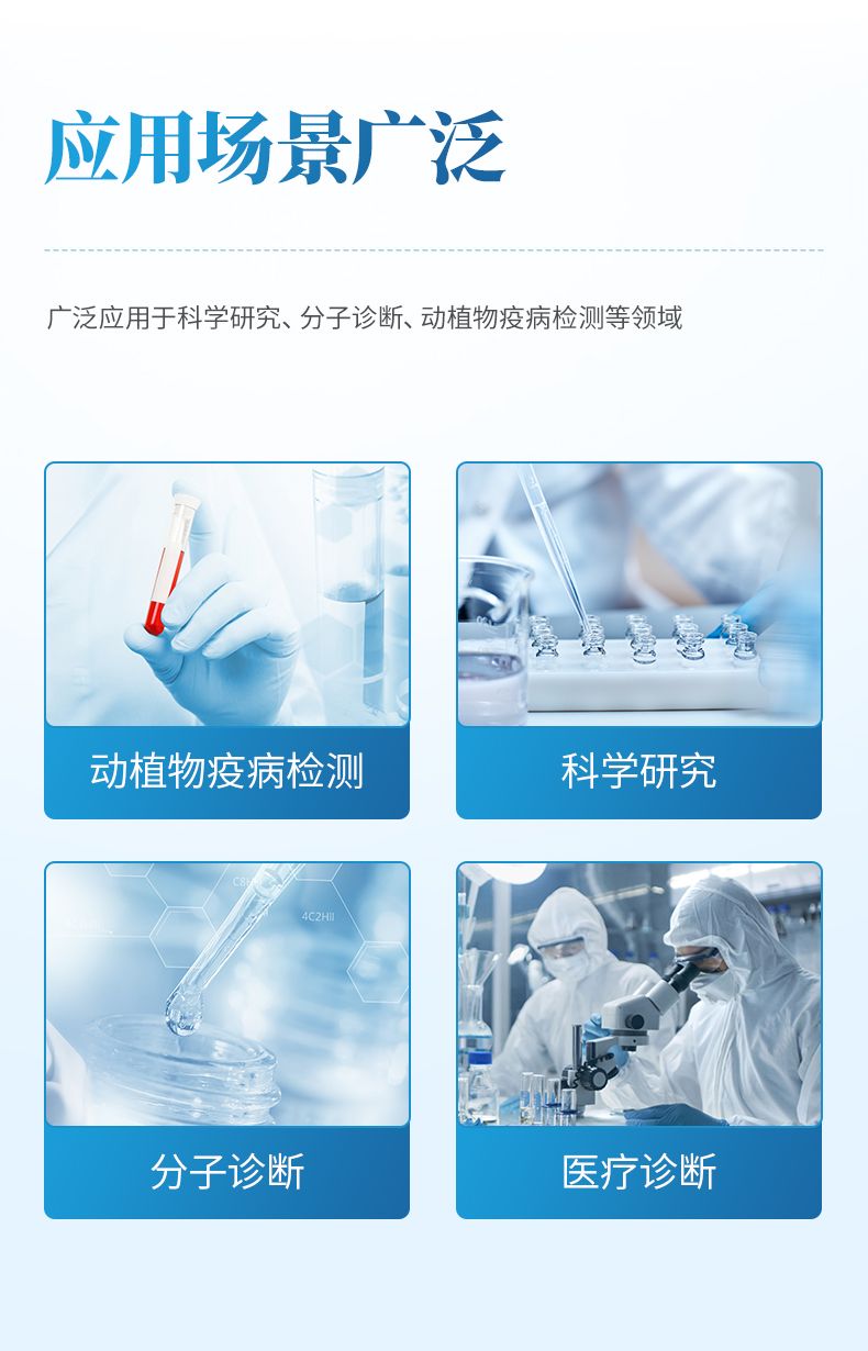 實現“樣本進-結果出”的全自動流程。PCR擴增在密閉的環境中進行核酸的擴增和檢測,可避免氣溶膠污染。儀器為開放系統,可適配市面上常見的試劑體系,應用場景廣泛,如動植物疫病檢測,現場快速檢測等。