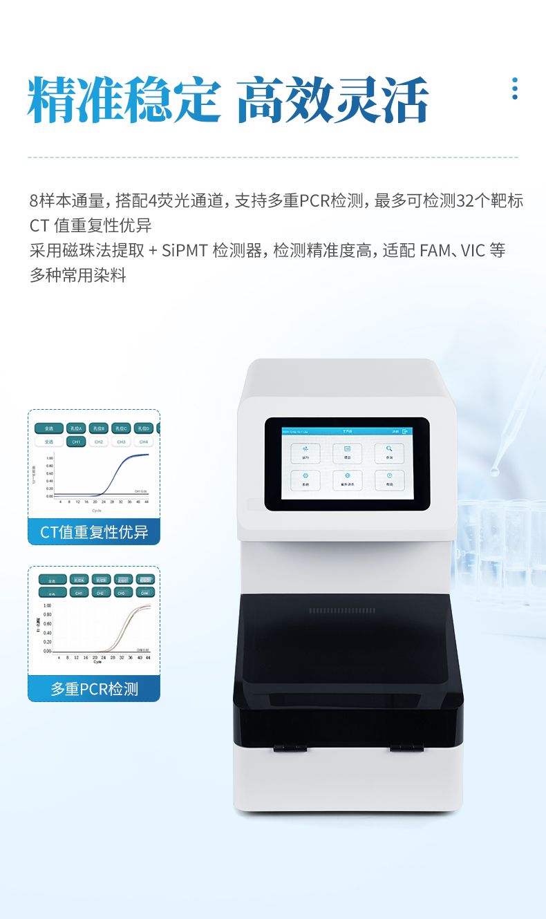 全自動核酸檢測設備是一款集核酸提取、 PCR擴增以及熒光檢測于一體。儀器配合通用磁珠法核酸提取試劑和熒光定量PCR試劑,一次實驗可支持8個樣本的QPCR檢測。用戶只需加入樣本,無需轉管,配液等復雜操作,可大大降低人工操作,