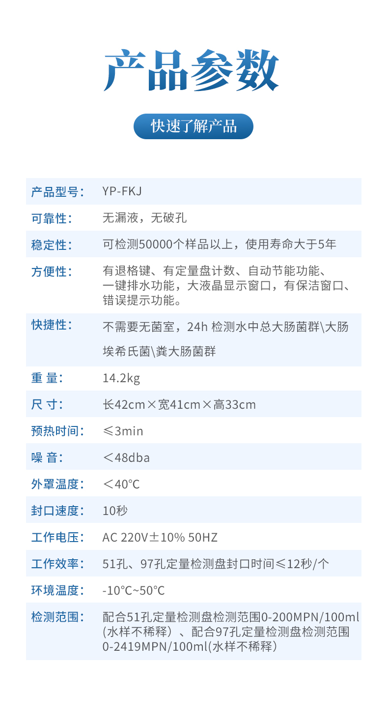 檢測(cè)范圍:配合51孔定量檢測(cè)盤檢測(cè)范圍0-200MPN/100ml (水樣不稀釋)、配合97孔定量檢測(cè)盤檢測(cè)范圍0-2419MPN/100ml(水樣不稀釋)